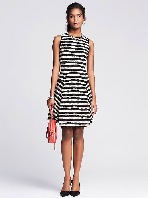 Loving this perforated stripe fit-and-flare dress from Banana Republic. The perforated jacquard fabric is very alluring and romantic, while still keeping its professionalism with the black and white stripe print. This dress is $130 at Banana Republic!